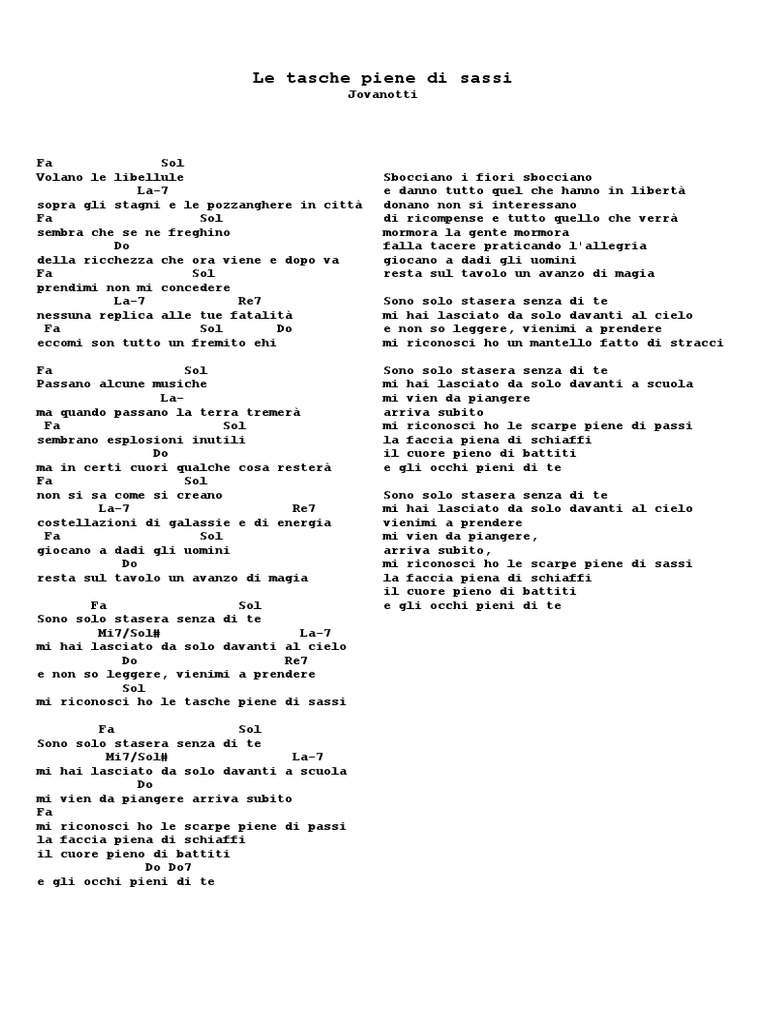 . Jovanotti - Le Tasche Piene Di Sassi Intro Bb9 A9 G9 C7 F G Volano le libellule Am7 sopra gli stagni e le pozzanghere in città F G sembra che se ne freghino C della ricchezza che ora viene e dopo va F G prendimi non mi concedere Am7 D7 nessuna replica alle tue fatalità F C eccomi son tutto un fremito ehi. La canzone è dedicata a Viola Cardinali madre del cantautore morta un anno prima delluscita del disco. Stiamo cercando di trovare o ricavarci lo spartito per pianoforteSi tratta di un successo che sta andando forte alle Radio su Itunes su internet grazie anche ai video di musica da youtubePer ora non sono riuscito a trovare lo spartito musicale per pianoforte di Le tasche piene di sassi ma solo il testo con gli.