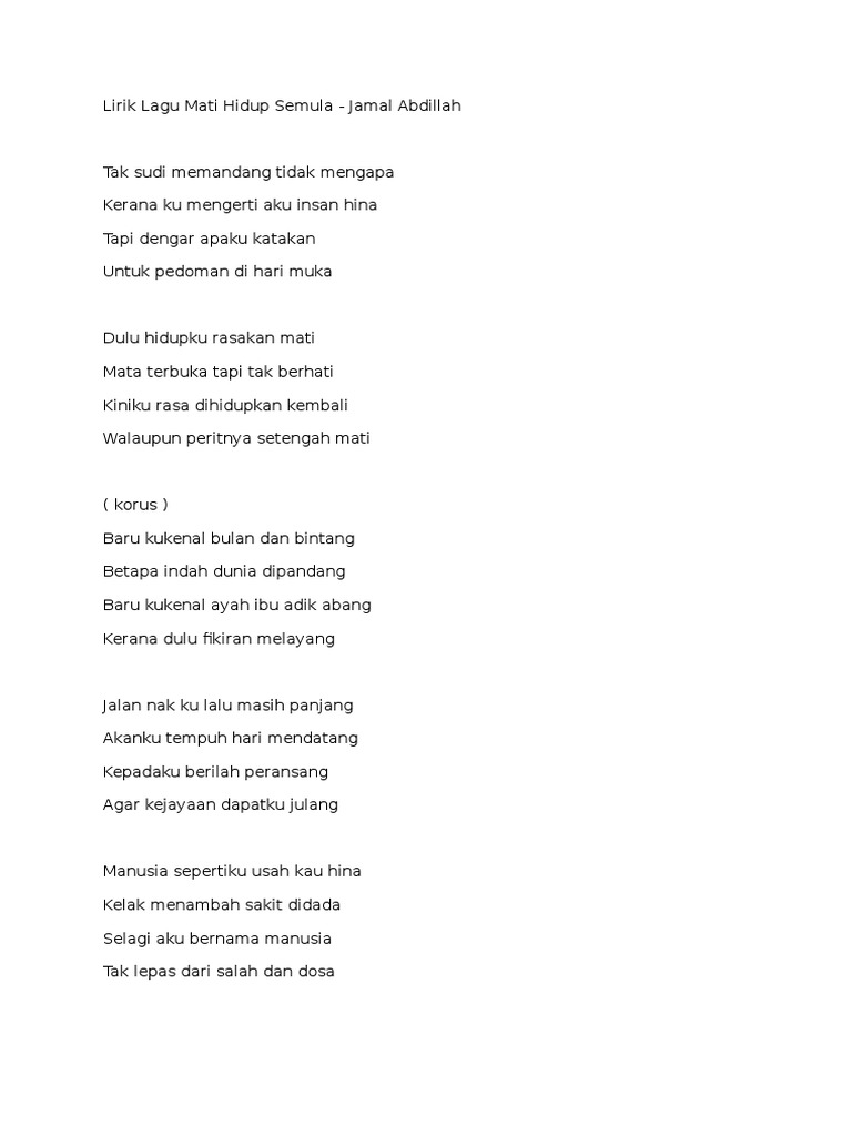 Jamal Abdillah Mati Hidup Semula Tak sudi memandang tidak mengapa Kerana ku mengerti aku insan hina Tapi dengar apaku katakan Untuk pedoman di hari muka Dulu hidupku rasakan mati Mata terbuka tapi tak berhati Kiniku rasa dihidupkan. Play online or download to listen offline free - in HD audio only on JioSaavn. There is no strumming pattern for this song yet.